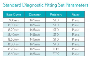 KeraSoft Thin is fitted using an 8 lens Fitting Set. There are 6 STD (Standard) periphery lenses ranging from 7.80 to 8.80 mm base curves