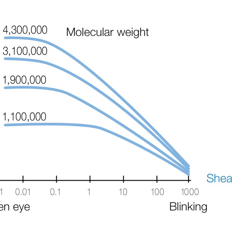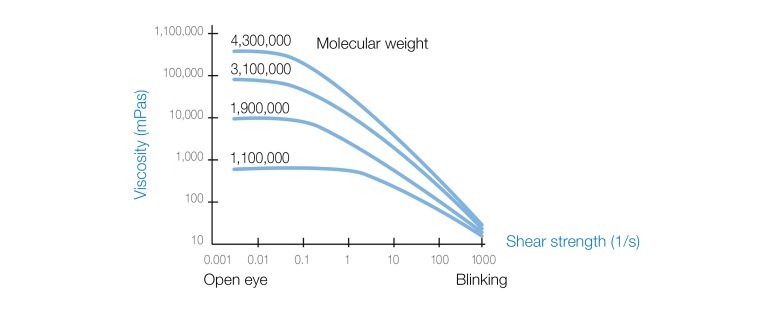 The graph below shows the viscosity of various hyaluronic acid solutions with different molecular weights crossed with the shear stress that is caused when blinking. It is clear from the graph that the higher the molecular weight, the greater the viscosity when the eye is open.