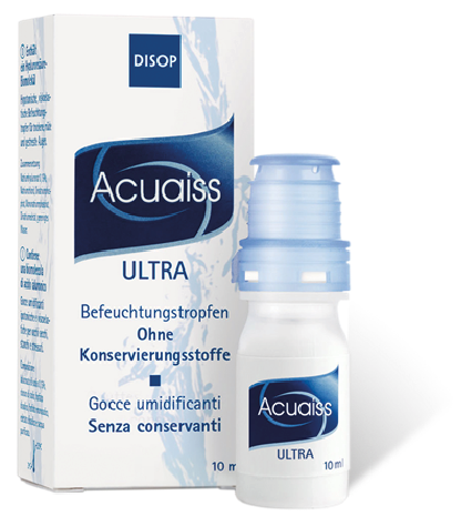 Acuaiss Ultra moisturising drops is a sterile, viscoelastic and hypotonic preservative-free solution in multidose format. It contains hyaluronic acid, which provides prolonged relief for dry,tired and stressed eyes