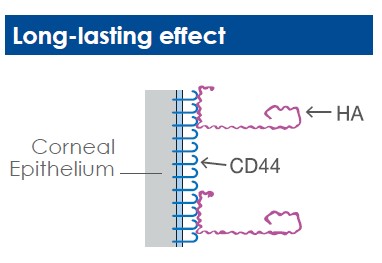 - Hyaluronic acid provides a long-lasting effect as the corneal epithelium contains CD44 receptors (glycoproteins) that recognise and bind to the HA molecule.